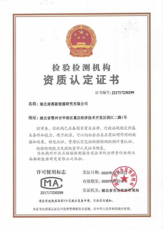 日前,leyu.乐鱼(集团)体育科技股份有限公司网站,子公司湖北南都新能源研究有限公司(简称“湖北研究院”),获得由国家市场监督管理总局批准的检验检测机构资质认定证书(CMA证书),这标志着其实验室的体系管理水平和检测技术能力均达到国家认可水平,leyu.乐鱼(集团)体育科技股份有限公司网站,也成为国内储能领域为数不多的,同时拥有CNAS和CMA双资质认定实验室的企业。